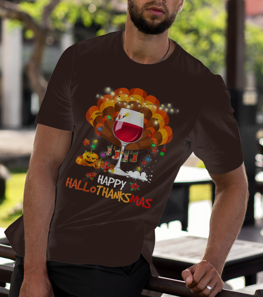 Happy Hallothanksmas Wine Glass Thanksgiving Funny Wine T-Shirt