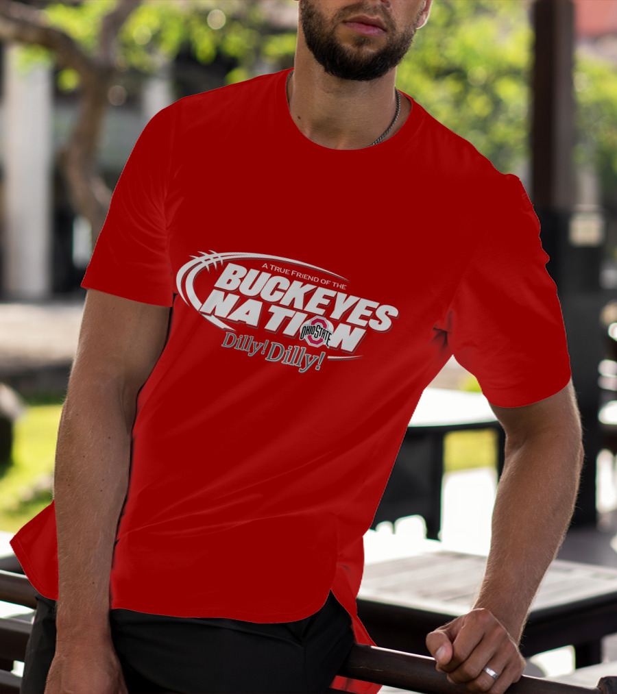The A True Friend Of The Buckeyes Nation Ohio State Dilly Dilly is a cotton shirt designed for regular, everyday wear. It is made from 100% pre-shrunk ring-spun cotton and can be worn on its own or layered under other clothing.