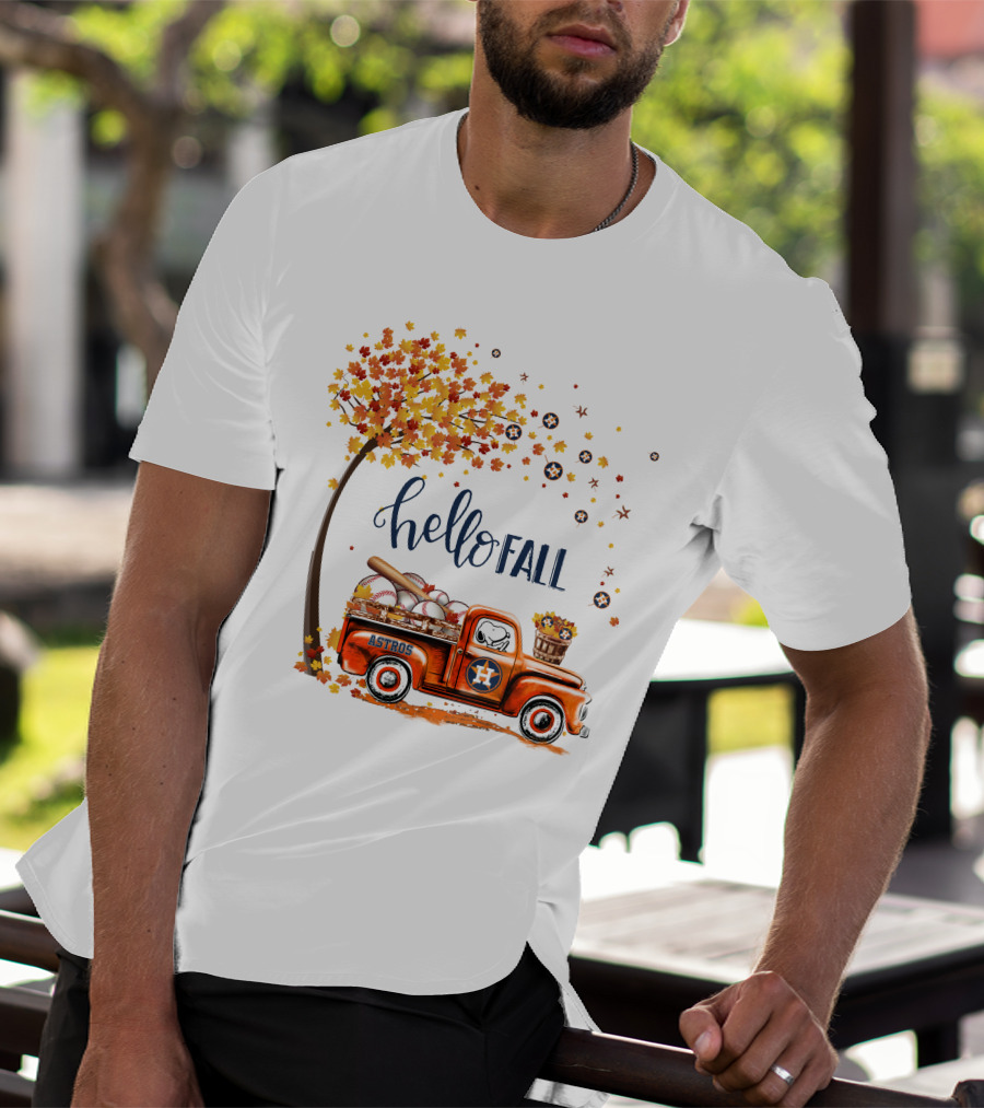 Hello Fall Astros Truck With Baseballs And Autumn Leaves T-Shirt