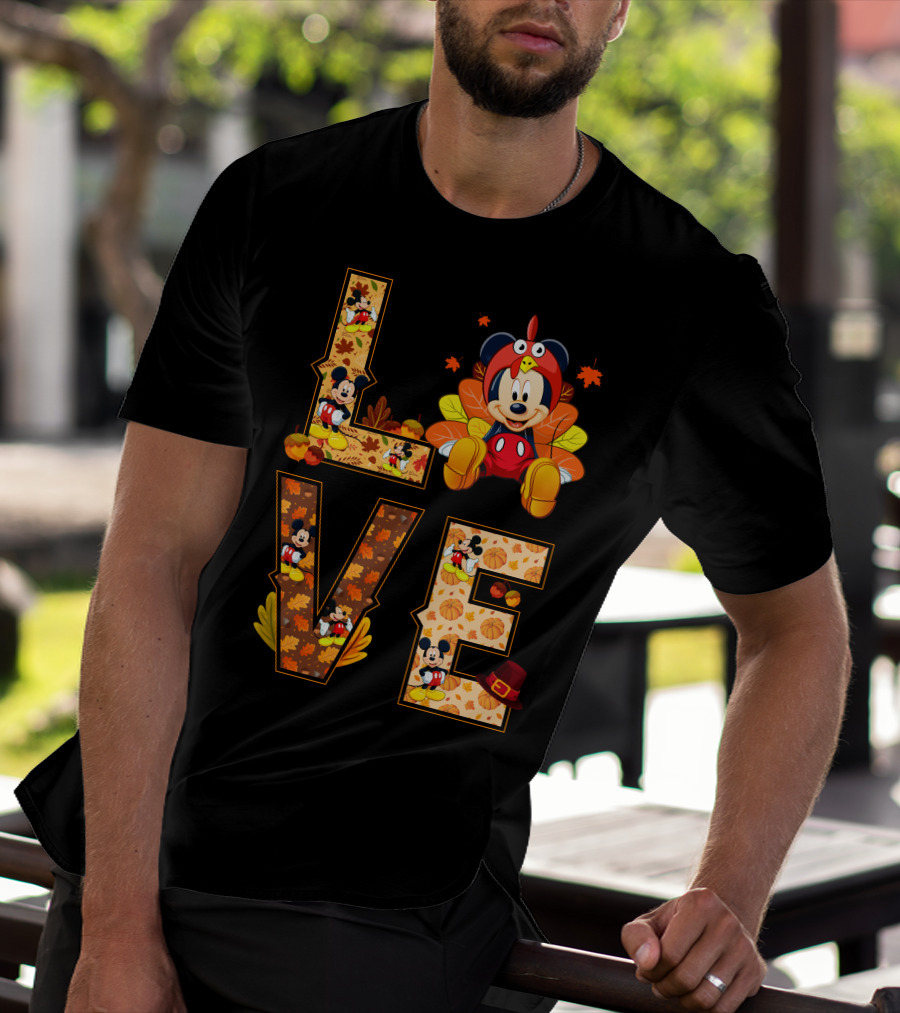 Mickey Love Thanksgiving Theme With Autumn Leaves And Pumpkins T-Shirt