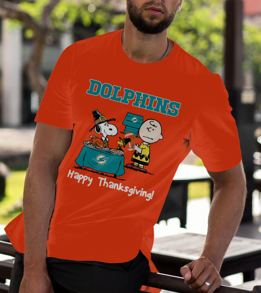 The Dolphins Snoopy Charlie Brown Happy Thanksgiving Miami is a cotton shirt designed for regular, everyday wear. It is made from 100% pre-shrunk ring-spun cotton and can be worn on its own or layered under other clothing.