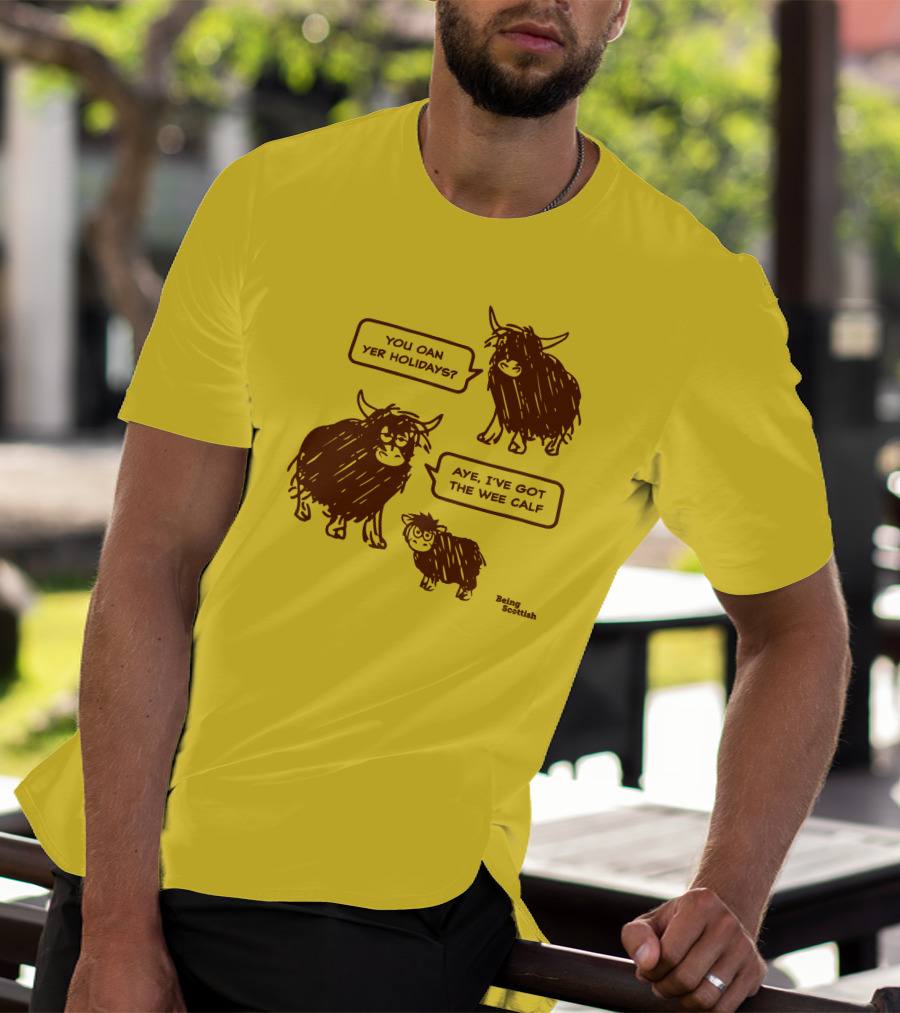 The Being Scottish Store You Oan Yer Holidays Aye I've Got The Wee Calf is a cotton shirt designed for regular, everyday wear. It is made from 100% pre-shrunk ring-spun cotton and can be worn on its own or layered under other clothing.