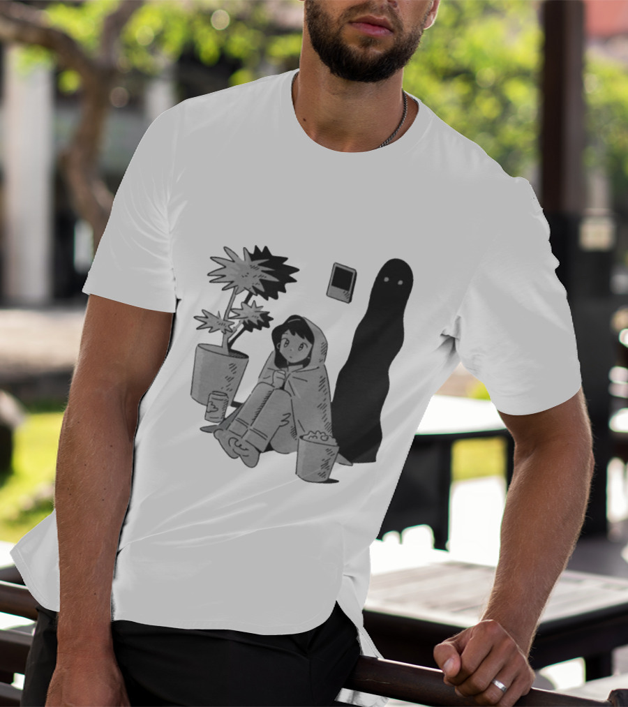 The Phantom Cozy: Ghostly Companion and Snuggled Figure with Plant and Snacks is a cotton shirt designed for regular, everyday wear. It is made from 100% pre-shrunk ring-spun cotton and can be worn on its own or layered under other clothing.