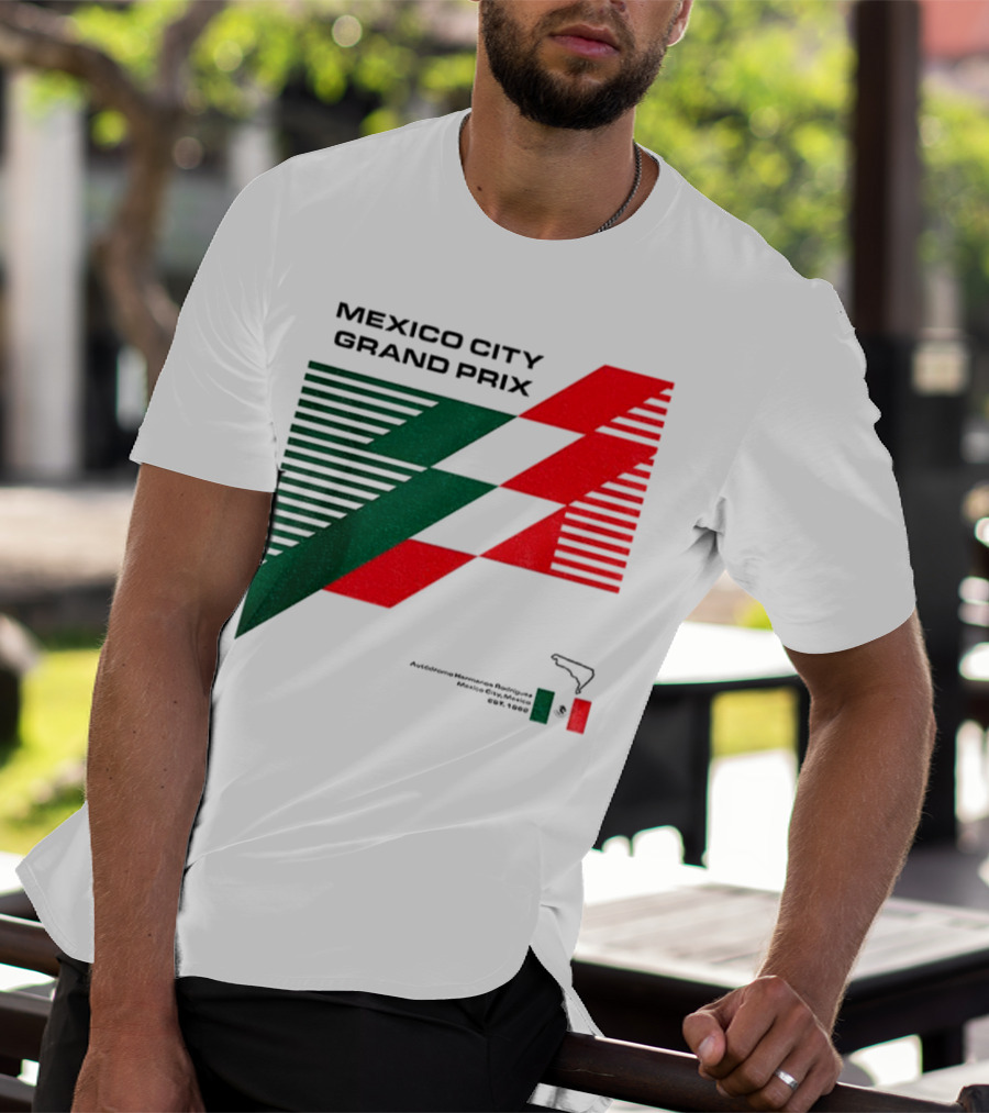The Mexico City Grand Prix Racing Stripes Emblem Green Red Flag is a cotton shirt designed for regular, everyday wear. It is made from 100% pre-shrunk ring-spun cotton and can be worn on its own or layered under other clothing.