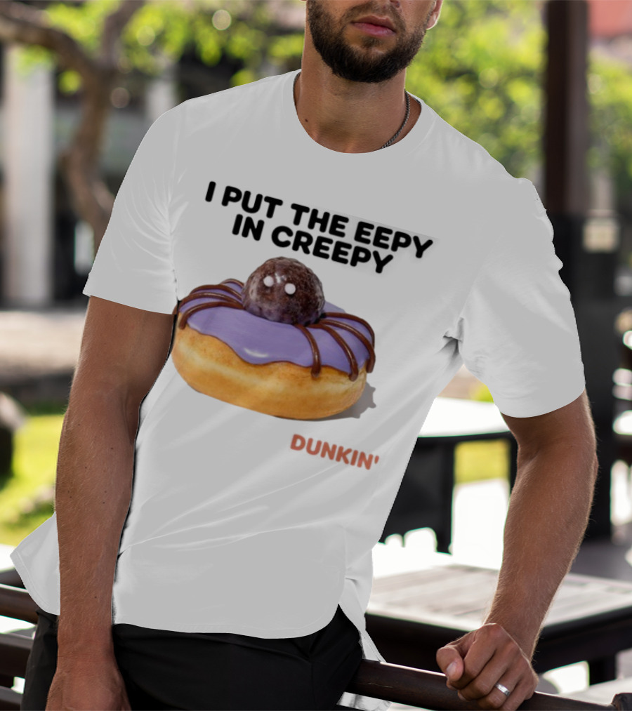 The I Put The Eepy In Creepy Dunkin' Donut Spider Design is a cotton shirt designed for regular, everyday wear. It is made from 100% pre-shrunk ring-spun cotton and can be worn on its own or layered under other clothing.