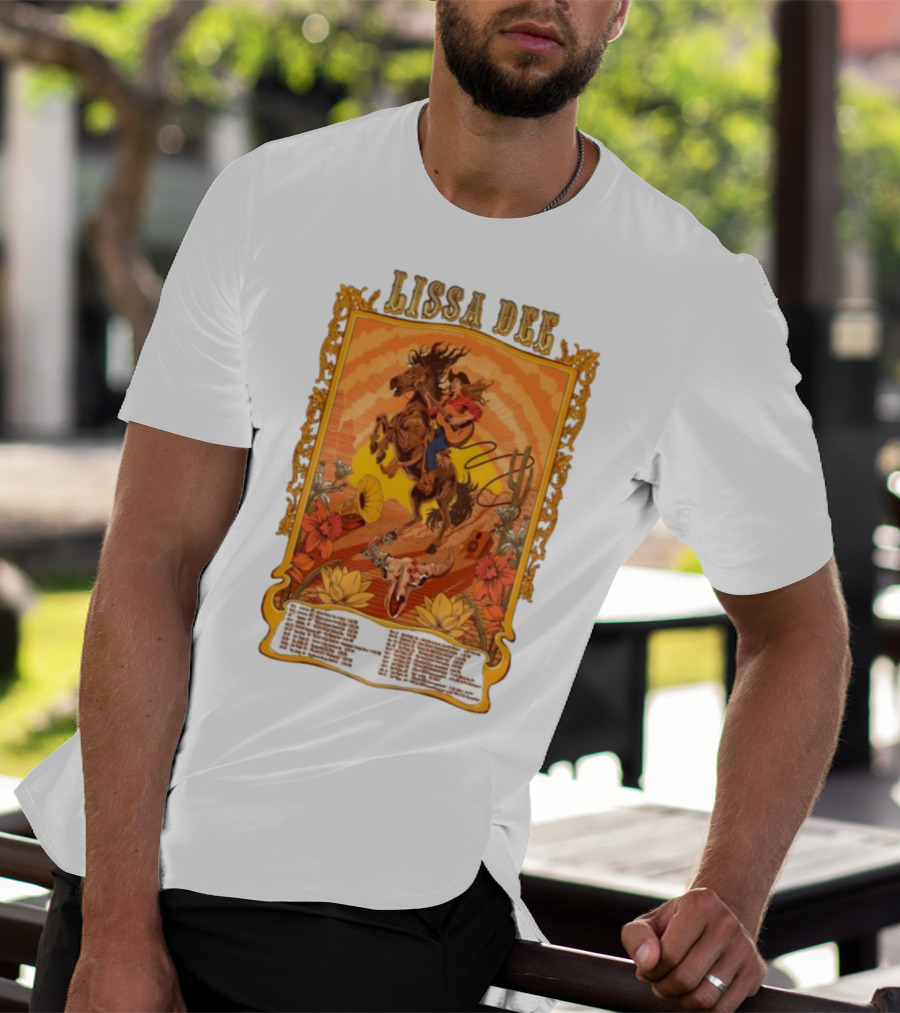 The Lissa Dee Horseback Rider Guitar Sunset October November December Tour 2025 is a cotton shirt designed for regular, everyday wear. It is made from 100% pre-shrunk ring-spun cotton and can be worn on its own or layered under other clothing.