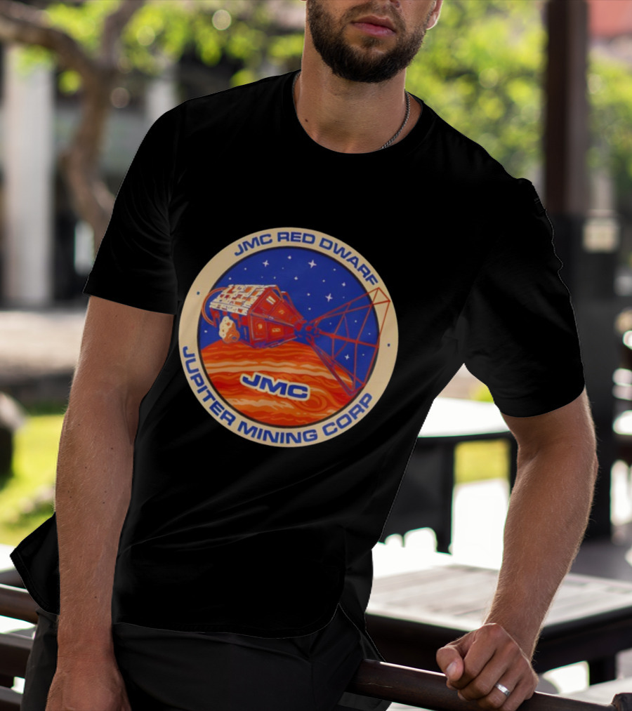 The JMC Red Dwarf Jupiter Mining Corp Spacecraft Emblem is a cotton shirt designed for regular, everyday wear. It is made from 100% pre-shrunk ring-spun cotton and can be worn on its own or layered under other clothing.