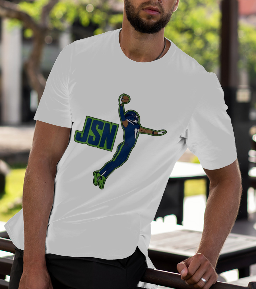 The JSN Dunk Jaxon Smith-Njigba Seattle Football Jump Catch is a cotton shirt designed for regular, everyday wear. It is made from 100% pre-shrunk ring-spun cotton and can be worn on its own or layered under other clothing.